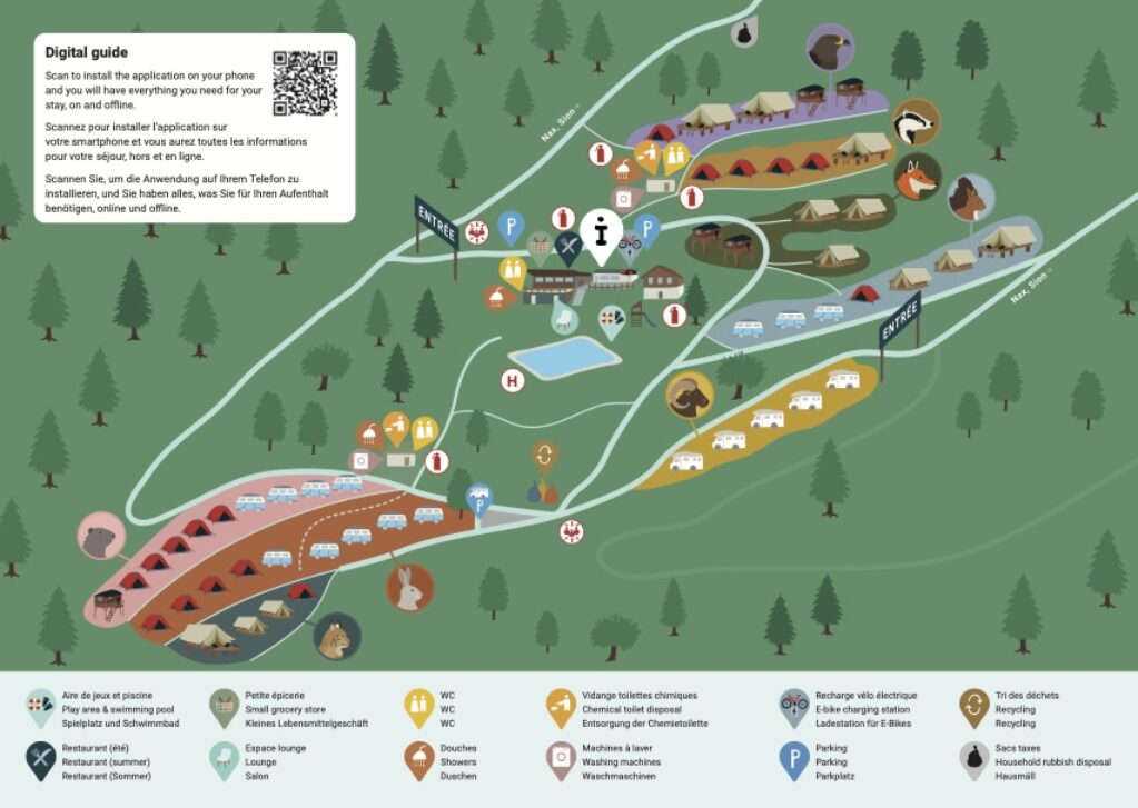 Located just 20 minutes from Sion, Alp Safari is easily accessible by car. For those traveling without a vehicle, direct public transport links from Sion railway station provide easy access to the campsite. The village of Nax, just above, offers essential amenities such as a bakery, a supermarket, several restaurants, and a local craft brewery.